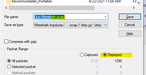 We’ll save the Wireshark capture as “Duo-Wireshark.pcap”, using File -> Export Speficified Packets, choosing to export only the Displayed packets and also making sure to save it as a .pcap file (not the default .pcapng) so that we can open it in VisiData: