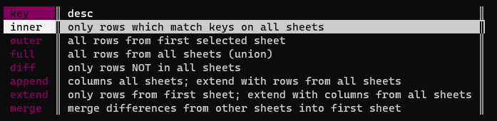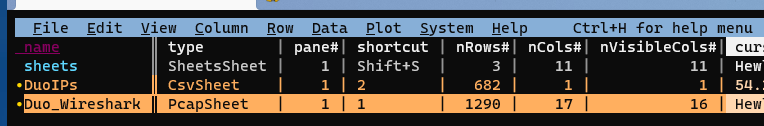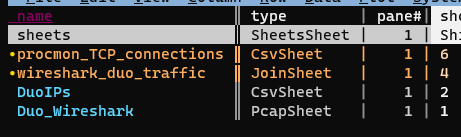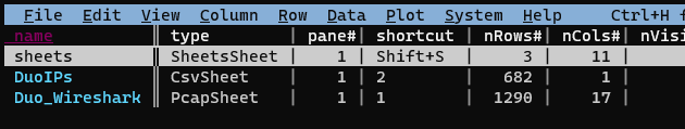 Now that we have two sheets, both containing a key column of the same type, we’ll perform an “inner join” on these two sheets in order to filter the Wireshark sheet to only packets sent to a Duo IP address. Go to the “sheets sheet” with Shift-S. This displays all the sheets we currently have open in VisiData: