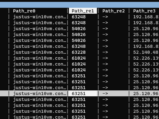 Okay, now we’ve finally got our three CSVs: Wireshark and ProcMon captures, and Duo IP addresses. Now the fun part: VisiData.